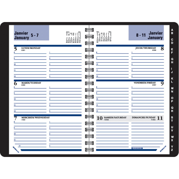 Marketing Information:One week per spread. Spiral binding. With monthly planners and phone/address directory.Mock-leather cover. Bilingual. Black.