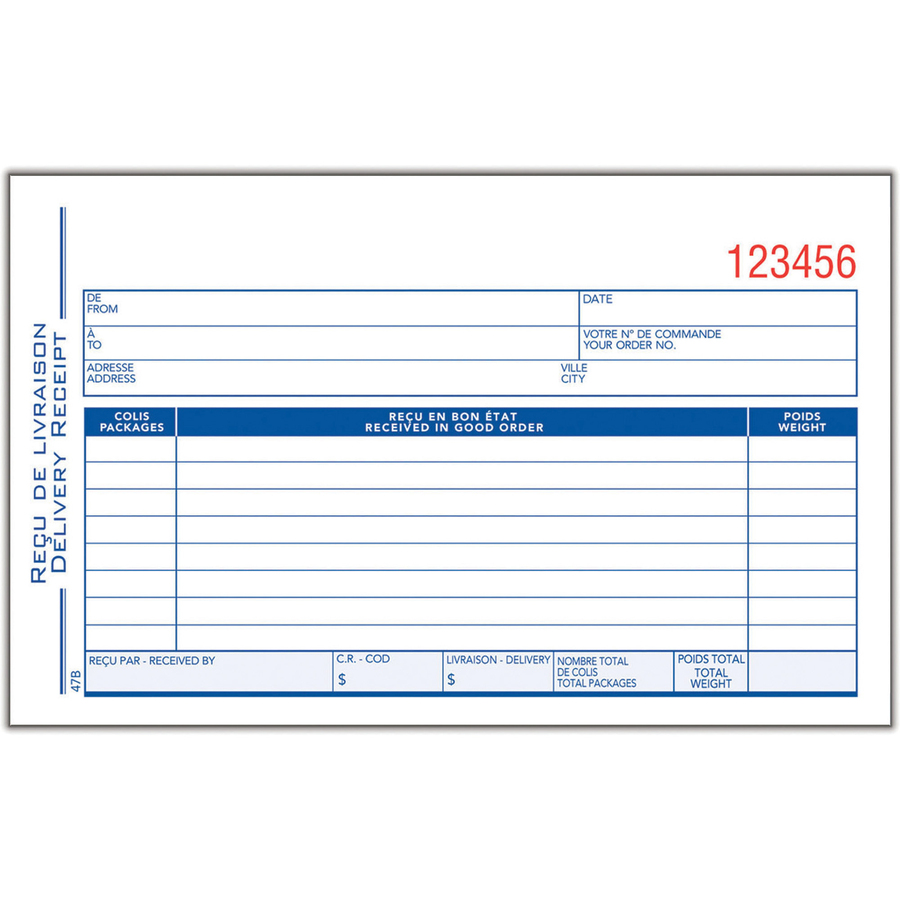Delivery/receipt forms are designed to help control delivery or receipt of products or services. Detailed format includes a space to record the number and description of order, signature of person receiving goods, and names of buyer and seller. Book includes consecutively numbered forms that are printed in blue ink on white paper with carbonless duplicates. Bilingual format allows convenient use by both English and French users.