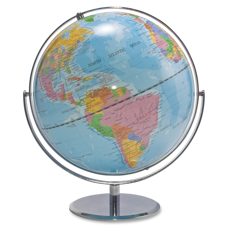 12″ Political World Globe with blue oceans features raised relief design and thousands of locations and geographical features highlighted with bright contrasting colors. Full meridian globe revolves on a base.