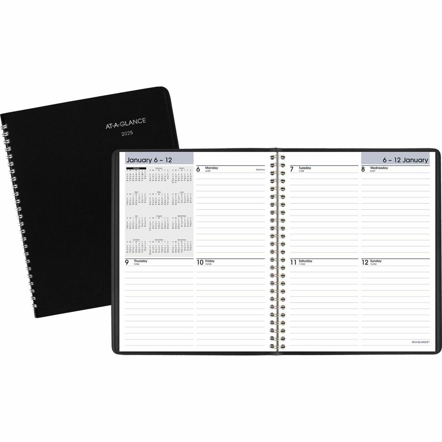 Weekly planner offers a neat way to get your schedule under control and organized. Dated planning pages range 12 months from January to December. Two-page-per-week spreads include ruled daily entries, Monday-through-Sunday scheduling, no appointment times for flexibility, count of days/days remaining, holidays and a shaded full-year calendar reference with the current reference month highlighted. Nonrefillable wirebound planner also features a simulated leather cover.