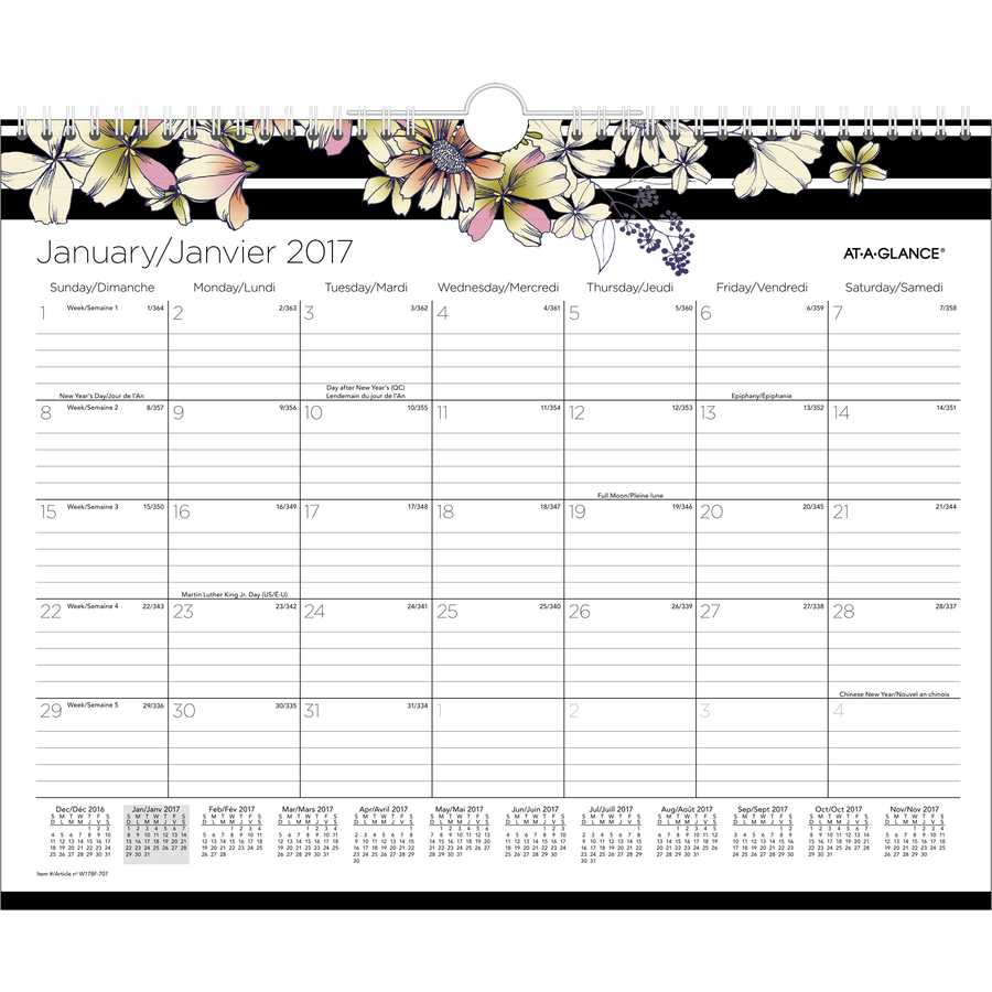 Manage upcoming plans and deadlines with this convenient bilingual wall calendar. It features a pretty Monique design with florals across the top and a bold, black border across the bottom of each page. Dated planning pages range 12 months from January to December. One-page-per-month format includes ruled daily blocks to keep handwriting neatly aligned, Sunday-through-Saturday scheduling, numbered weeks, count of days/days remaining, holidays and past, current and 10 future months reference. Pages are printed in English and French. Twin-wire binding with hanging loop allows easy wall display.