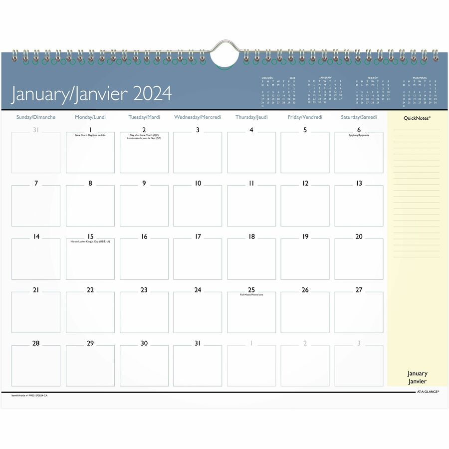 Marketing Information:Clean sleek design for versatile planning. High-quality paper features superior ink bleed resistance Full 12 months of monthly planning. Twin coil binding and hang loop. Multiple reference calendars. Dedicated QuickNotes sections. Large open blocks with room for notes and reminders. 15″ x 12″. Bilingual.