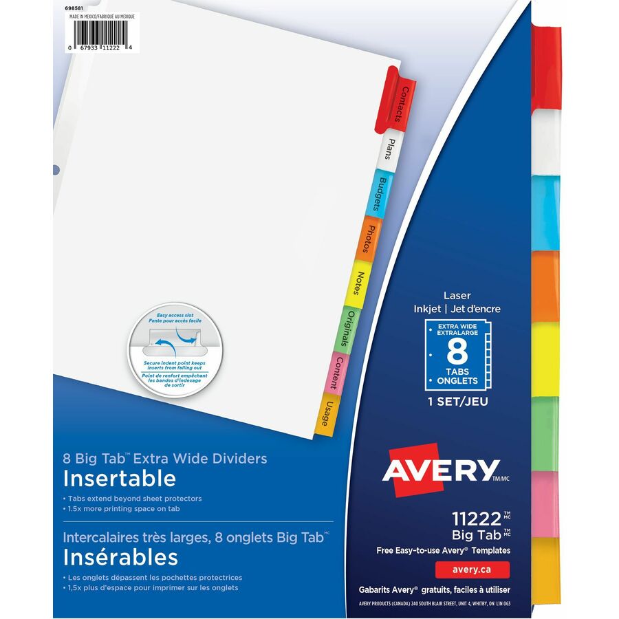 Marketing Information:Organize notes, documents and more with Avery 11222 Big Tab 8 tab dividers for 3 ring binders. The body of each divider is made with white paper and the tabs are constructed from durable, clear plastic to withstand everyday wear and tear. The extra-wide design works perfectly with sheet protectors so that you can still view your tabs at a glance. Each plastic tab includes an easy access slot so that inserts can glide in while the secure indent point ensures that the insert stays locked in place. The larger, Big Tab divider design lets you display 50% more information than standard divider tabs. Fill the extra space with more text, logos or symbols to tailor these dividers for your needs. Designed to be tear-resistant, the edges of each divider are laminated with a clear border on both sides to reinforce the pre-punched binder holes so that they can withstand repeated page flipping and use. A sheet of handwrite-compatible and printable inserts are included that are compatible with both laser and inkjet printers. Personalize your own unique divider tab designs with custom images and text with free templates and software by visiting the Avery site. 1 set of 8 dividers is included. Whether you are a student organizing class notes, an office admin archiving files, a teacher keeping track of graded homework or a parent storing bills and other important documents, Avery dividers are the perfect way to organize your life in style.