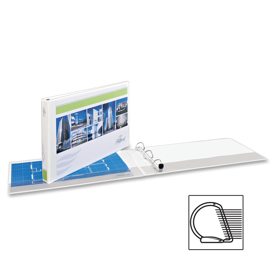 Tabloid-size view binder features durable construction that is ideal for frequent reference. The 11″ x 17″ size is perfect for engineering documents, blueprints, planograms, financial spreadsheets and more. Two clear interior pockets offer improved organization and storage. One-touch EZD ring opens and solidly locks closed with a single touch. Rings are back-mounted so pages lie flat. Heavy-duty view binder also features exposed rivets on back.