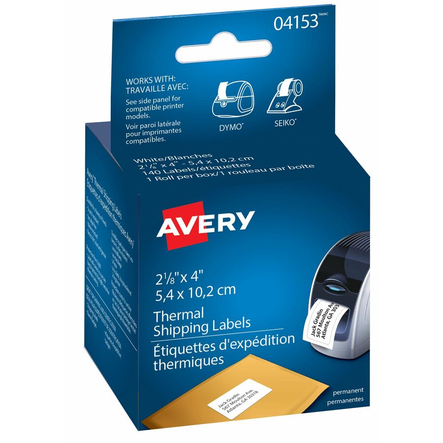 Marketing Information:Print Labels one at the time. Eliminate the need for expensive ink and toner by using versatile Thermal Shipping Labels. These labels use direct thermal printing instead of ink and come out looking polished and professional. Compatible with select models of the Seiko Smart Label Printer® and Dymo LabelWriter® printers The bright white material provides reliable contrast and barcode readability. The permanent adhesive ensures labels will stick and stay put to make organizing and locating your things easier. These labels are smudge-free, scratch and water-resistant while repelling dirt, dust and grease. The labels come packaged in rolls, making it easy for you to print one label or a hundred. Whether you’re sticking them on outgoing mail, file folders or product samples, these durable labels will help bring order to items in your home or office. Labels are easy to customize with free templates and designs using the Avery® Design & Print Online Software.