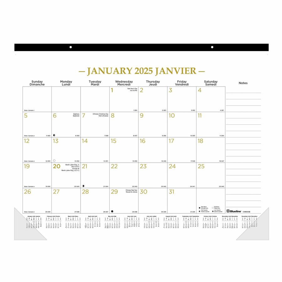 Desk pad with a trendy gold design covers 12 months from January to December for complete planning all year long. Large blocks and a ruled notes section offer extra space to keep track of your projects, schedules, daily notes and more. Tear-off sheets are bound at the top and perforated for clean, consistent removal. Reinforced chipboard backer provides a sturdy writing surface and helps protect your desk from scuffs and scratches. A full-year reference calendar is at the bottom of each page to easily see past and upcoming dates. Bilingual format allows easy use by both English and French users. Desk pad is perfect for any home, school or office.
