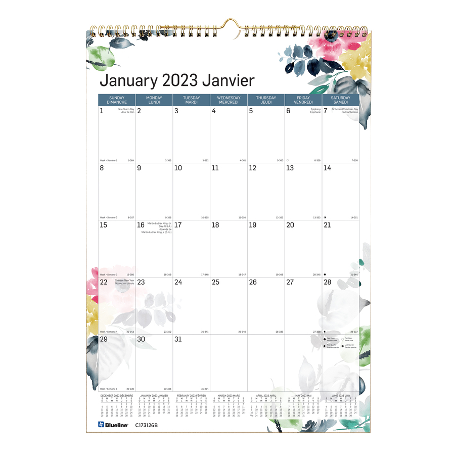 12 x 17 in. 12 months. One month per sheet, one block per day. Annual calendar at the bottom of each sheet. Reinforced cardboard support. Double spiral binding with eyelet for hanging. Bilingual.