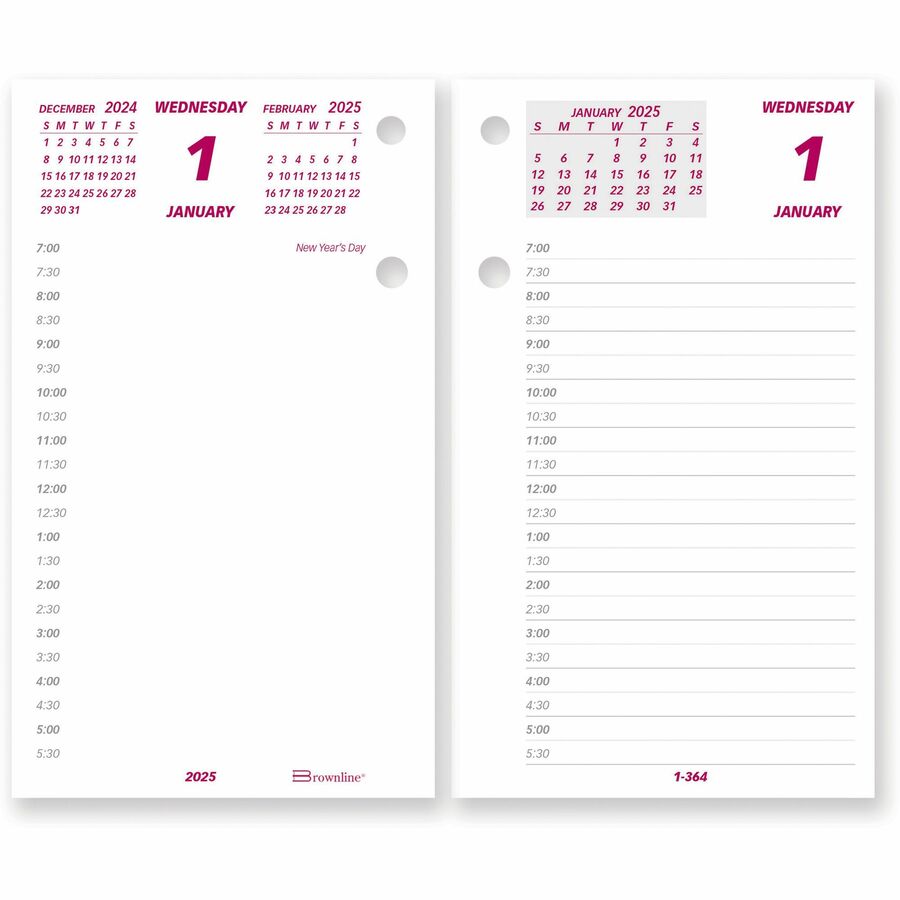 Daily calendar pad refill is designed for use with Rediform C2S Calendar Stand. Dated planning pages range 12 months from January to December. Two-page-per-day spreads include hourly appointment times from 7 AM to 5:30 PM on one page, and unruled hourly appointment times from 7 AM to 5:30 PM on the second page, count of days/days remaining, holidays, and past, current and future months reference across both pages. Planner is printed in English.