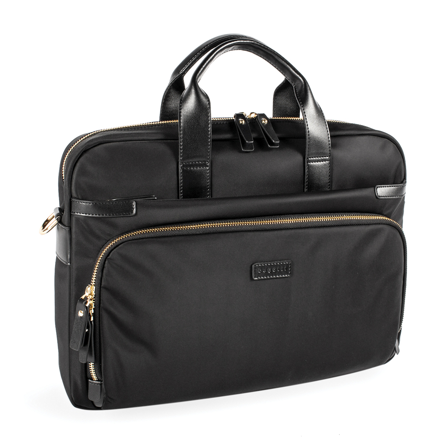 Marketing Information:Nylon with veritable leather finish. Up to 15.6” fully padded computer compartment. Front pocket organizer with a gold zipper. Adjustable and removable nylon shoulder strap. 16 x 4 x 11.5″H. Black.