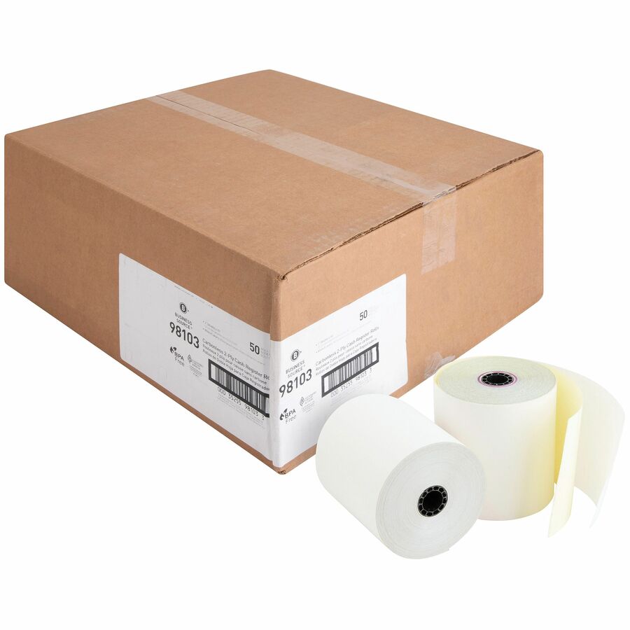 Two-part cash register rolls are carbonless to create instant copies of receipts for your customers. You keep the white original while your customer keeps the canary copy. High-quality construction delivers clear results. Carbonless element is made of vegetable oil-based ink. End-of-roll warning feature keeps you prepared for replacement time. The recyclable core of the roll and the packaging are made of plastic. The 3″ x 90′ rolls are made from SFI Certified carbonless paper.