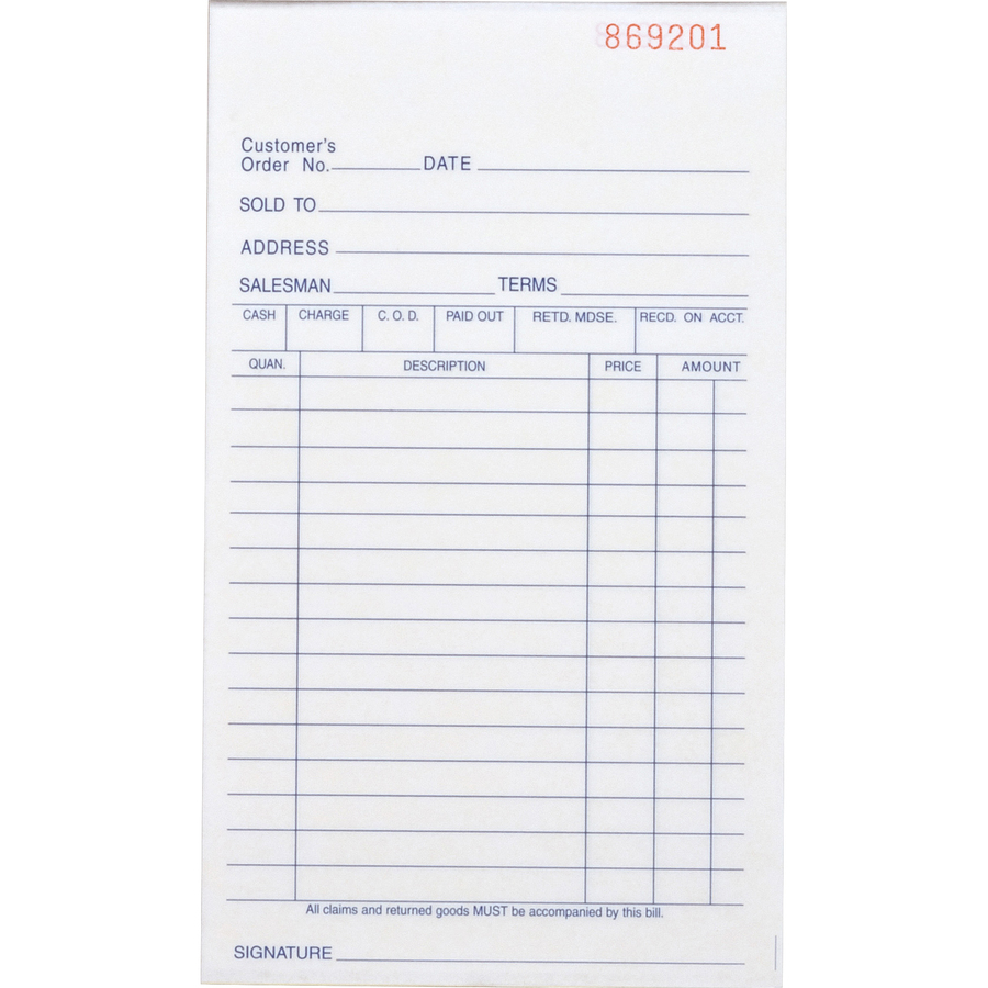 All-purpose book of carbonless forms can be used for orders, sales, purchase orders, credit memos or receiving forms. Versatile, two-part forms include prompts for date, “sold to,” buyer’s address, salesperson’s name, terms, seller’s signature, item description with quantity, price and amount. A line of boxes above the item description allows you to check or fill out “Cash,” “Charge,” “C.O.D.,” “Paid Out,” returned merchandise and received on account. Forms are consecutively numbered in red ink and perforated at the top for easy tear-out. Paper sequence is originals in white and duplicates in canary.