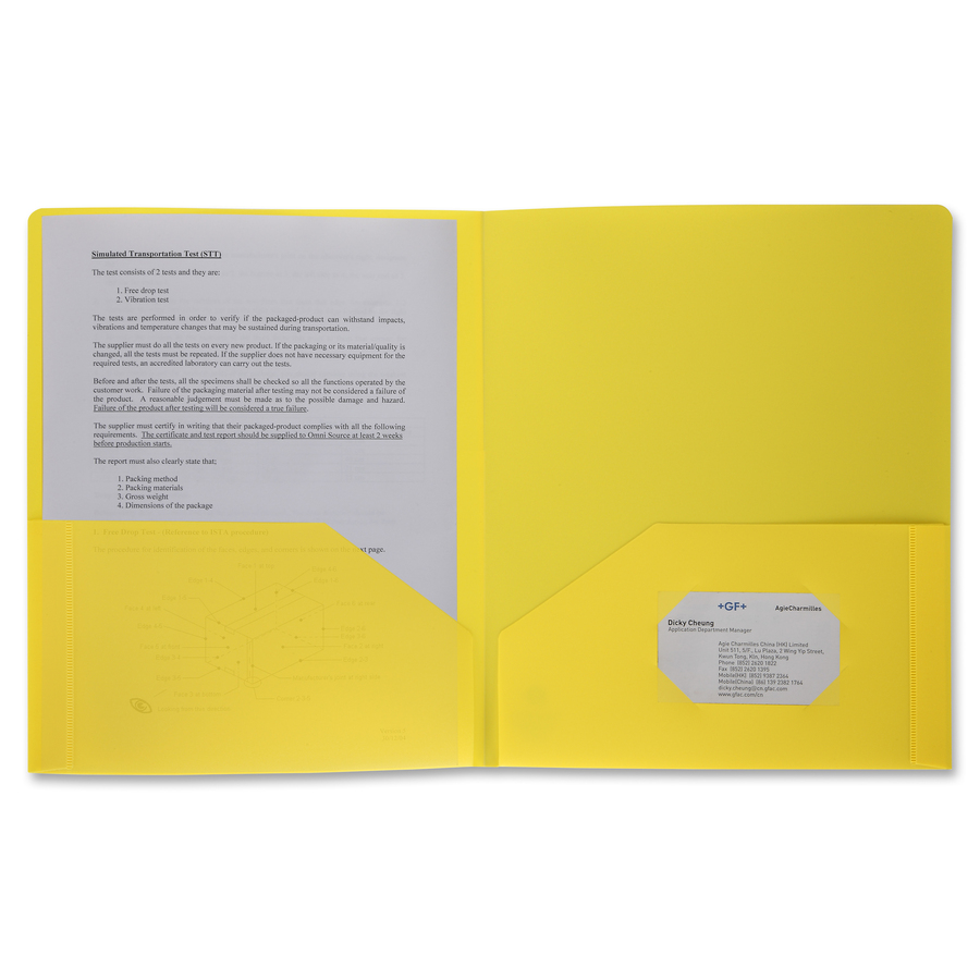 Poly portfolio with two pockets offers durable construction for presentations or storage. Archival-quality, 0.3 mil thick poly protects your letter-size documents from spills and wear. The inside left pocket features a die-cut business card holder to make your presentation complete. Each pocket holds 15 sheets and is sealed on two sides.