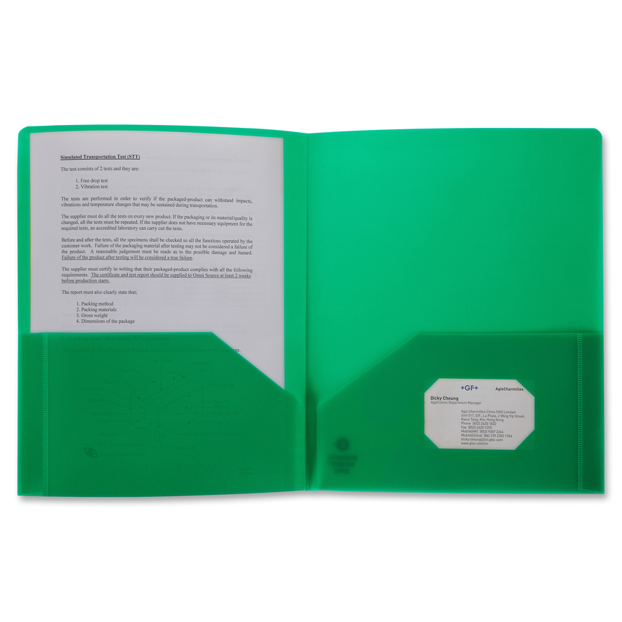 Poly portfolio with two pockets offers durable construction for presentations or storage. Archival-quality, 0.3 mil thick poly protects your letter-size documents from spills and wear. The inside left pocket features a die-cut business card holder to make your presentation complete. Each pocket holds 15 sheets and is sealed on two sides.