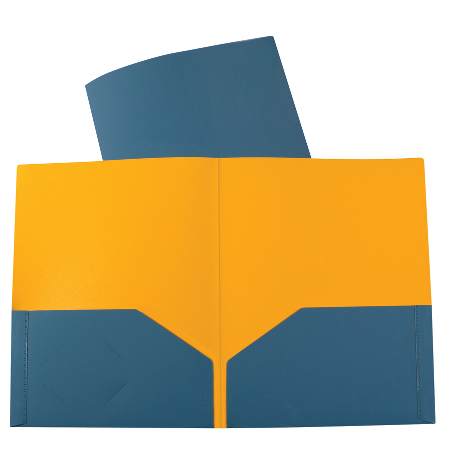 Ideal for classroom and office settings, two-pocket folders are an essential presentation and document storage item. Keep track of letter-size documents by organizing them in these durable portfolios. Sophisticated two-pocket folders hold presentations and proposals. Stylish two-tone material features an eye-catching mirror finish exterior and subtle matte finish interior. Super heavyweight poly material resists tearing. Features business card slot on front inside pocket. For letter size materials. Steel blue/amber orange color combination.