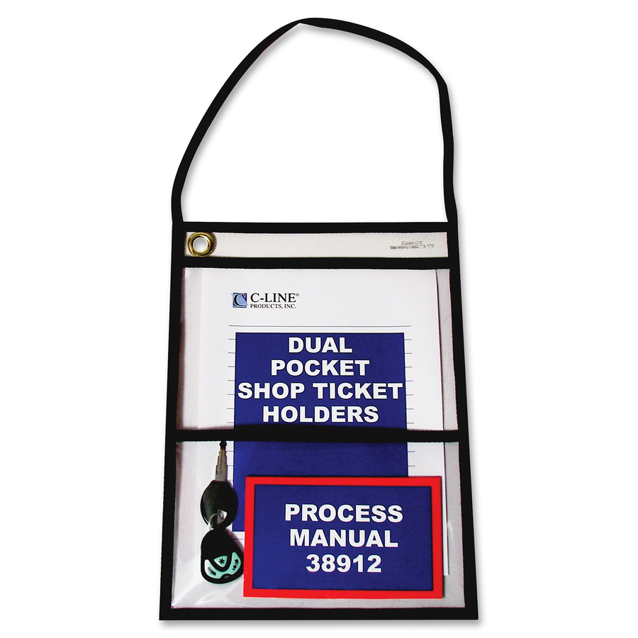 Shop ticket holder keeps documents and small items safe in two pockets. Large pocket (9″ x 12″) holds papers, catalogs, schedules, lists and more. Small pocket (9″ x 6″) holds CDs, keys, notes and all other corresponding job information. Use convenient strap and eyelet at top for hanging. Durable, heavy-duty vinyl pocket has a flap with a hook-and-loop closure. Strong, rigid, clear vinyl allows easy visibility of documents. Reinforced, black stitched edge offers durability.