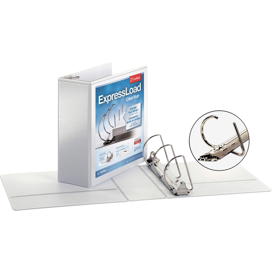 D-ring view binder features a straight post design that makes it easy to load contents. Ideal for multiple presentations and reports. Straight Post-D ring design removes the hassle of maneuvering sheets over the curve while protecting them from damage during loading/unloading. Locking steel rings hold contents securely and are back-mounted to reduce wear and let pages lie flat. 4″ capacity holds approximately 750 sheets. Horizontal interior pockets offer quick and convenient storage. Each pocket holds 40 sheets. Clear, nonglare overlays on front, spine and back allow easy customization on all three sides. Poly material will not stick to cover inserts or materials stored inside. Poly material is safe for all documents including photographs. ExpressLoad ClearVue Locking D-Ring Binder also offers cold crack-resistance to 5 degrees Fahrenheit, a sturdy chipboard core and exposed rivets.