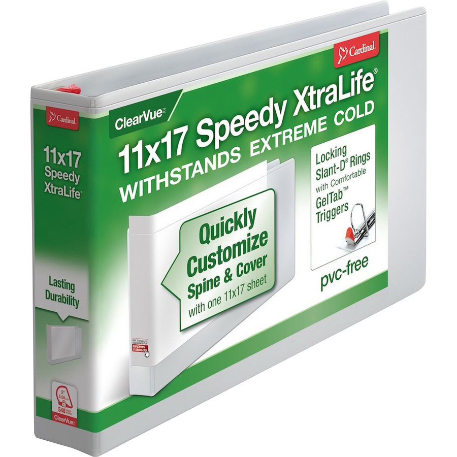 Slant-D ring binder for tabloid-size documents features a unique, polyolefin cover material. This material is not only better for the environment when produced and disposed, but also so strong that it’s guaranteed not to split or tear for three years. Cover is cold crack-safe to negative 50 degrees Fahrenheit. Nonstick cover has clear, nonglare overlay on the front, spine and back for easy customization. Quickly customize spine and cover with one letter-size sheet. Speedy XtraLife Nonstick Locking Slant-D Ring Binder is designed to hold 11″ x 17″ sheets. Locking Slant-D shape rings with GelTab triggers hold 25 percent more sheets than standard round rings. Back-mounted steel rings provide a clean professional spine and reduce wear. 2″ ring capacity holds approximately 540 sheets. Two inside pockets for loose papers each hold 40 sheets. Binder also features a sturdy chipboard core and exposed rivets.