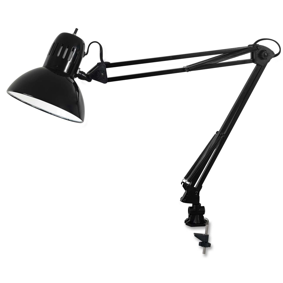 Edge-mount clamp-on incandescent swing arm lamp features a 30″ reach spring-balanced swing arm that directs light right were you need it. Attaches to surfaces up to 2″ thick with a metal clamp. Fingertip locking knob prevents arm from swinging once you’ve set the lamp to your desired position. Swing arm lamp includes a convenient rotary on/off switch and uses a 60 watt incandescent bulb, sold separately.