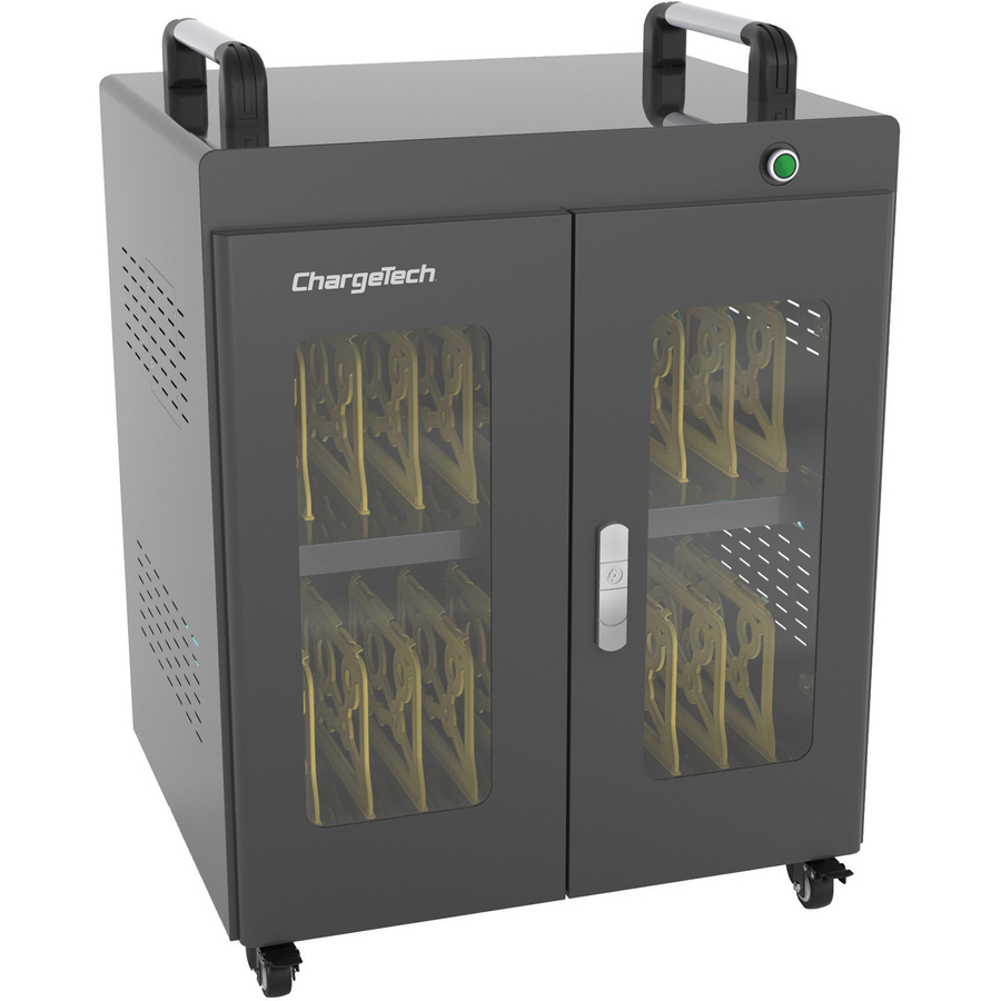 20-bay charging cabinet features ultraviolet lights to kill ultraviolet lights to kill 99 percent of bacteria on your devices in just 5 minutes. The simple one-touch control system makes sure your laptops, phones and tablets can be disinfected and stored with just the touch of a button. An intuitive cooling system prevents overheating and promotes a more efficient charge. Tamperproof glass and safety lock ensure your devices are securely contained. Locking wheels prevent movement on smooth surfaces to stay reliably in place. AC-powered charging cabinet is perfect for many industries including healthcare, education, government, retail and more.