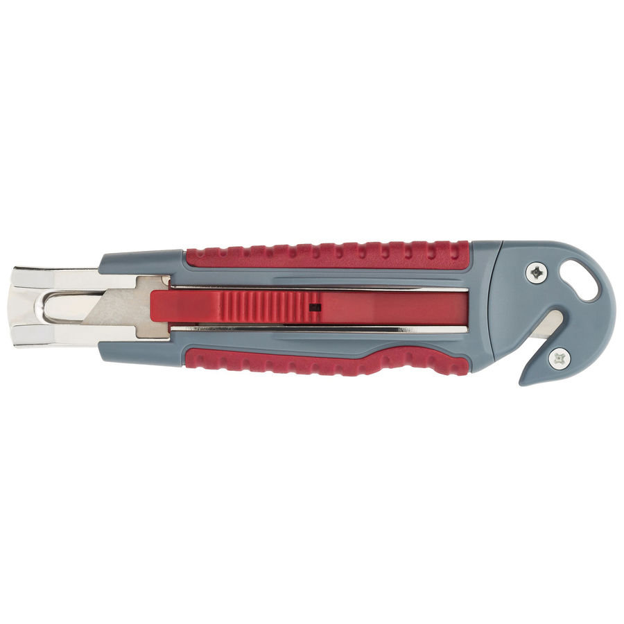 Utility knife features a titanium-bonded blade that’s three times harder than untreated stainless steel to maintain a lasting sharpness. Auto-retract, push-button system provides an enhanced level of safety while cutting. Corrosion-resistant construction stays strong through daily use for long-lasting performance. Plastic comfort grip fits securely in your hand for greater control and smooth handling. Integrated quick cutter lets you safely cut twine, rope, boxes and more without dulling your blade.