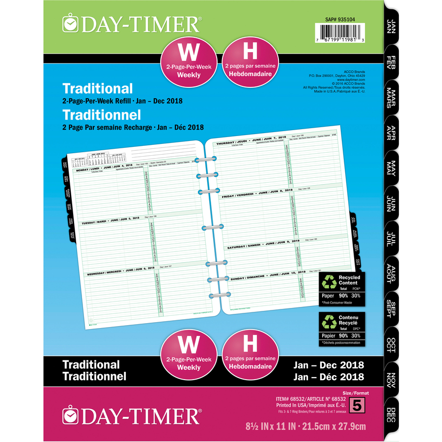Loose-leaf planner refill helps you manage meetings and to-dos, as well as keep track of projects or expenses. One-year supply of dated, weekly planner pages with 12 tabbed monthly calendar pages keep you organized all year long. Two-page-per-week schedule is broken down from Monday to Wednesday on the left-hand page and from Thursday to Sunday on the right-hand page for easy viewing. Monthly pages feature a ruled, one-month calendar on the front. While the reverse includes a two-column, ruled layout for notes, with past and future month reference calendars. Bilingual format accommodates both English and French speaking users. Desk-size filler set also includes additional sheets for detailed organization, a loose-leaf address/phone directory, advance planning pages and 12 monthly auto mileage/expense forms as well as a set of useful reference sheets. Desk-size refill pages are designed for use with any compatible seven-ring, Day-Timer planner cover (sold separately).