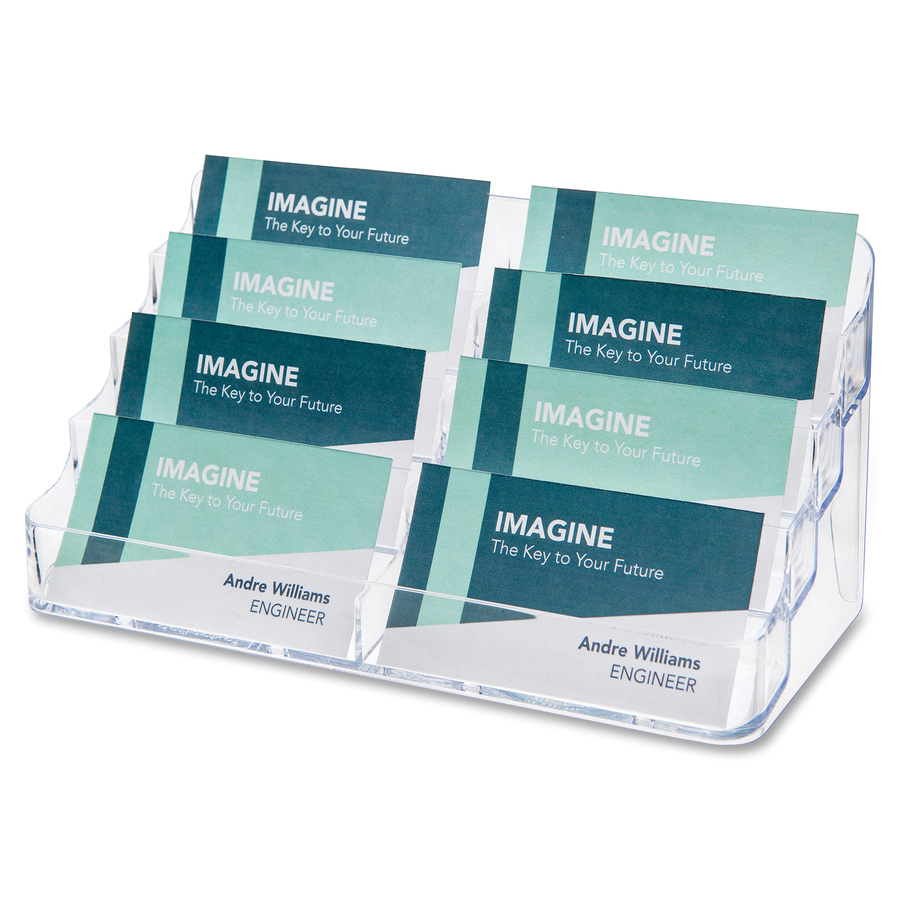 Low-profile Desktop Business Card Holder is ideal for doctors’ offices, travel agencies and retail outlets. Clear acrylic design provides full visibility. Eight pockets are arranged in two rows on an incline. Each compartment holds approximately 50 cards. Use card holder on counter or desktop.