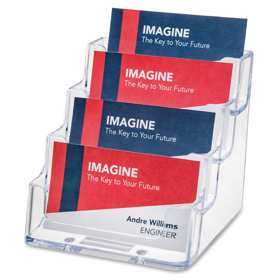 Low-profile business card holder is ideal for doctors’ offices, travel agencies and retail outlets. Clear acrylic design provides full visibility. Four pockets are arranged in one row on an incline. Use card holder on counter or desktop.