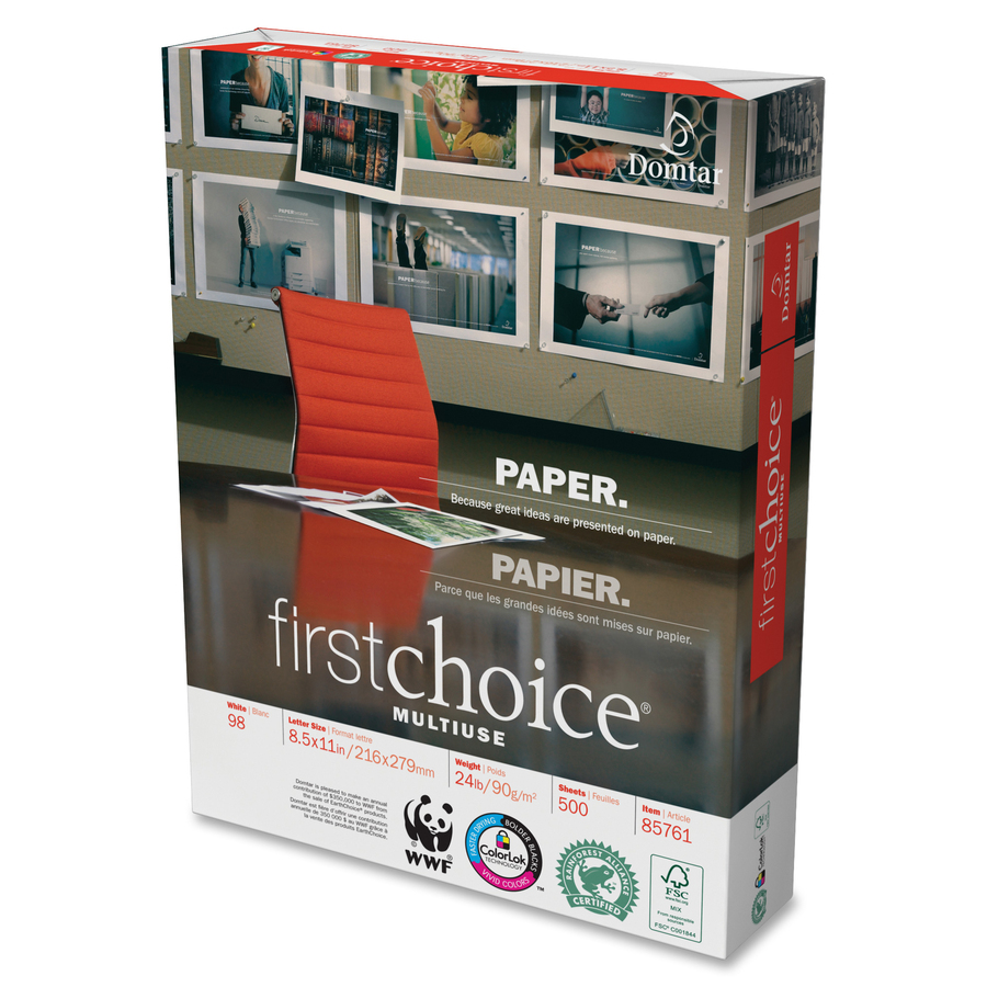 First Choice MultiUse is a presentation-quality paper that produces rich colors and sharp details for text and graphics reproduction on a variety of imaging equipment. With its high brightness and heavy, 24 lb. basis weight, First Choice MultiUse has a true quality look and feel. ColorLok Technology delivers bolder blacks and vivid colors with inkjet printing. Paper is also Forest Stewardship Council (FSC) certified by the Rainforest Alliance.