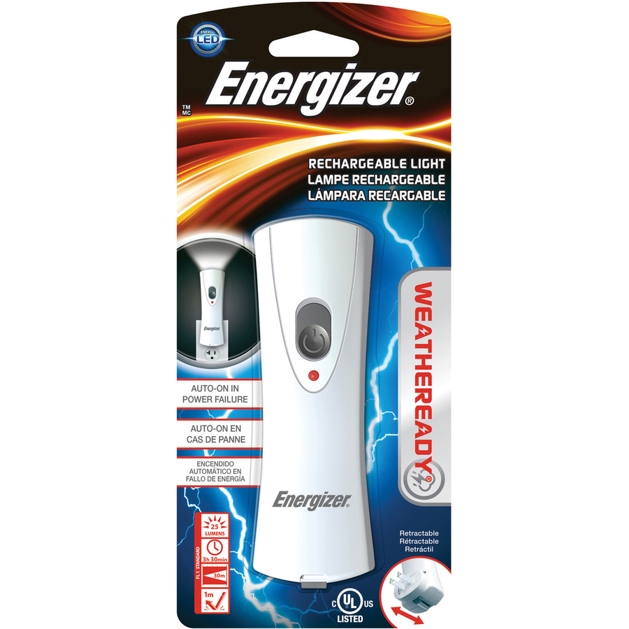 Weather Ready Light offers a rechargeable LED light that automatically turns on when your power shuts down. Auto-on nightlight can run 15 hours on low mode. Design features a bright white Nichia LED and focused lens for a uniform spot. Ready light includes one NiMH battery.