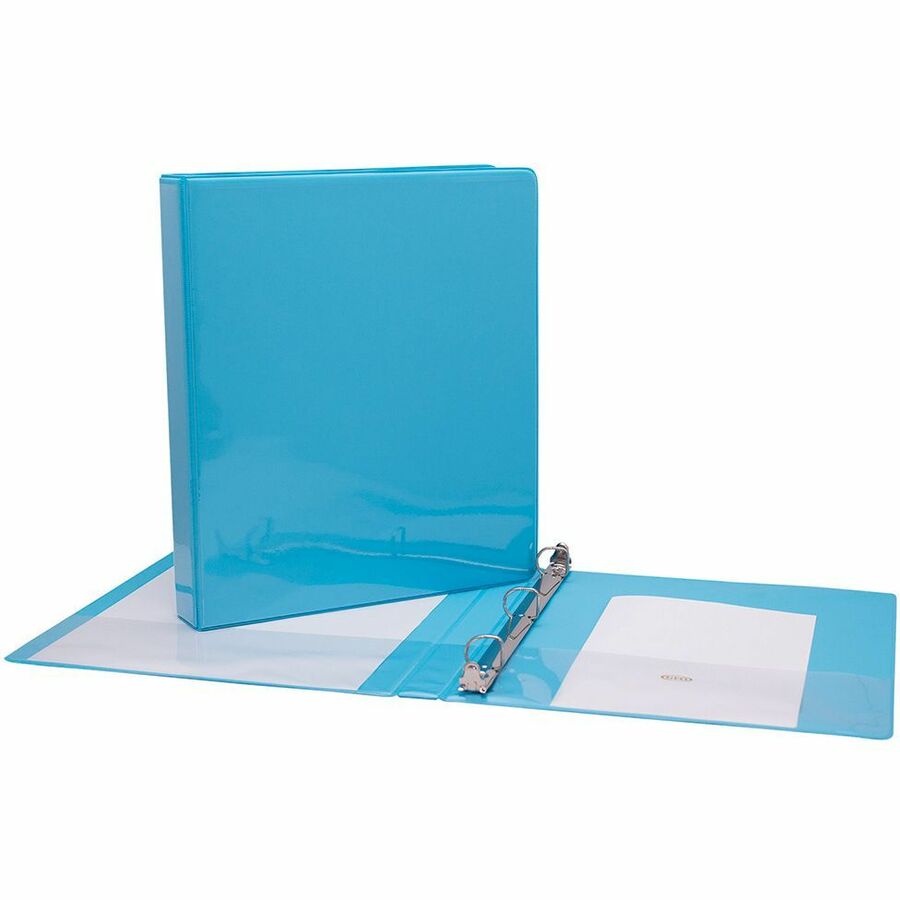 Vinyl. D rings. Clear pockets on front, spine and back. 2 pockets includes inside.