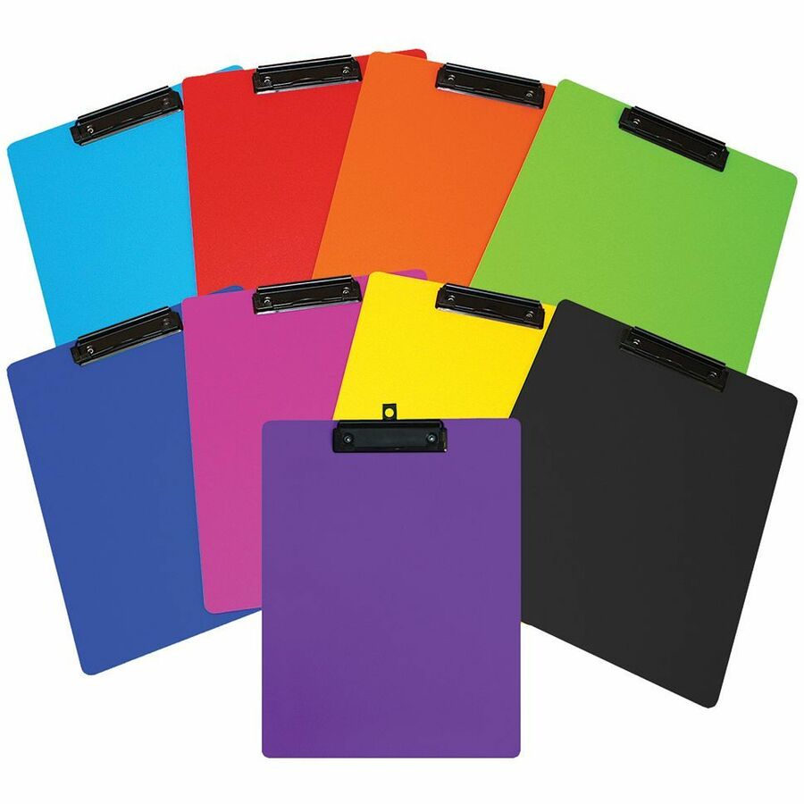 Writing board made of heavy-duty plastic with retractable hook. Letter size. 8 assorted colors.