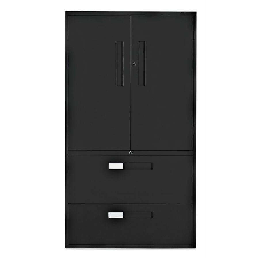 Combination storage cabinet with 3 shelves, One of which is adjustable and lateral filing cabinet with 2 fixed front drawer. 2 locks. 36 x 18 x 65-1/4″H.