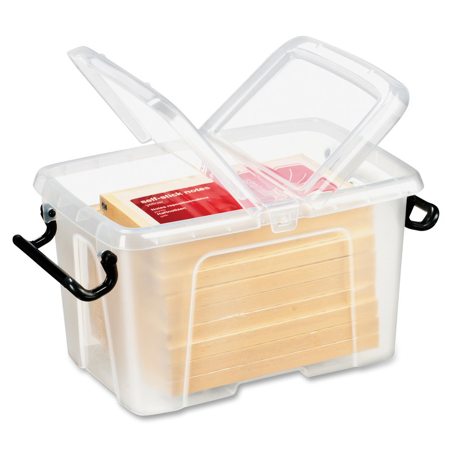 Smart box features an easy-access lid that opens from each end for easy entry without removing the entire lid. Roll-up locking handles snap into place to keep the boxes securely closed even when dropped. Clear material lets you easily see your items without requiring you to open the box. Smart box is perfect for storing and organizing pens, markers, blinder clips and more.