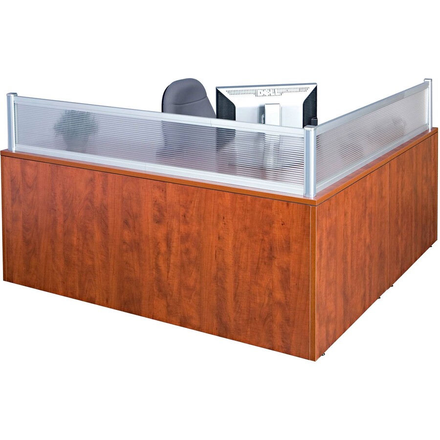 Panel with an aluminum trim is part of the Outlines Desktop Panel System that adds a privacy barrier for Heartwood Innovations Series Reception Counters. This supportive panel bolsters an Innovations transaction counter. It made from recyclable, clear polycarbonate so it is light and durable and will not discolor over time. Transparent construction allows as much natural light into the work space as possible. Posts (sold separately) secure the polycarbonate panels. Order two panels and three posts to support an L-shaped transaction counter (sold separately). Mounting hardware is included.