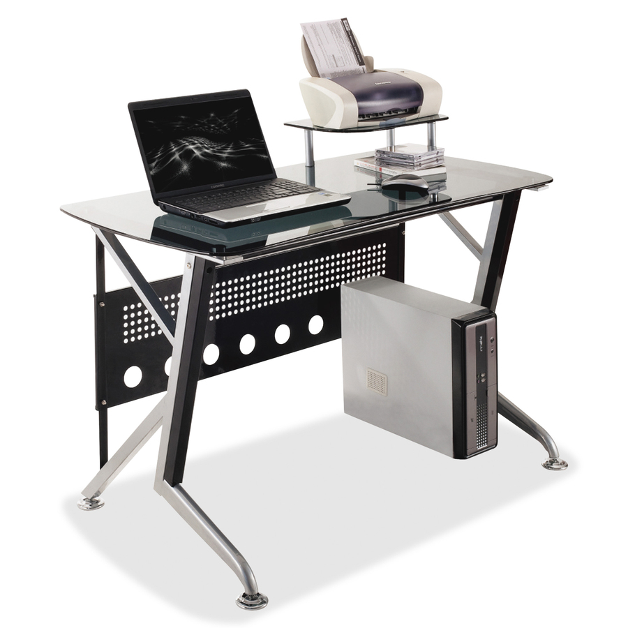 The simplistic design of this computer desk blends glass and metal materials in a unique, modern style. Smoked glass desktop is tempered for strength and safety. Modesty panel features large and small holes that are elegantly patterned to enhance its visual appeal. Abstract metal legs provide a graceful way to enhance the look of any environment.