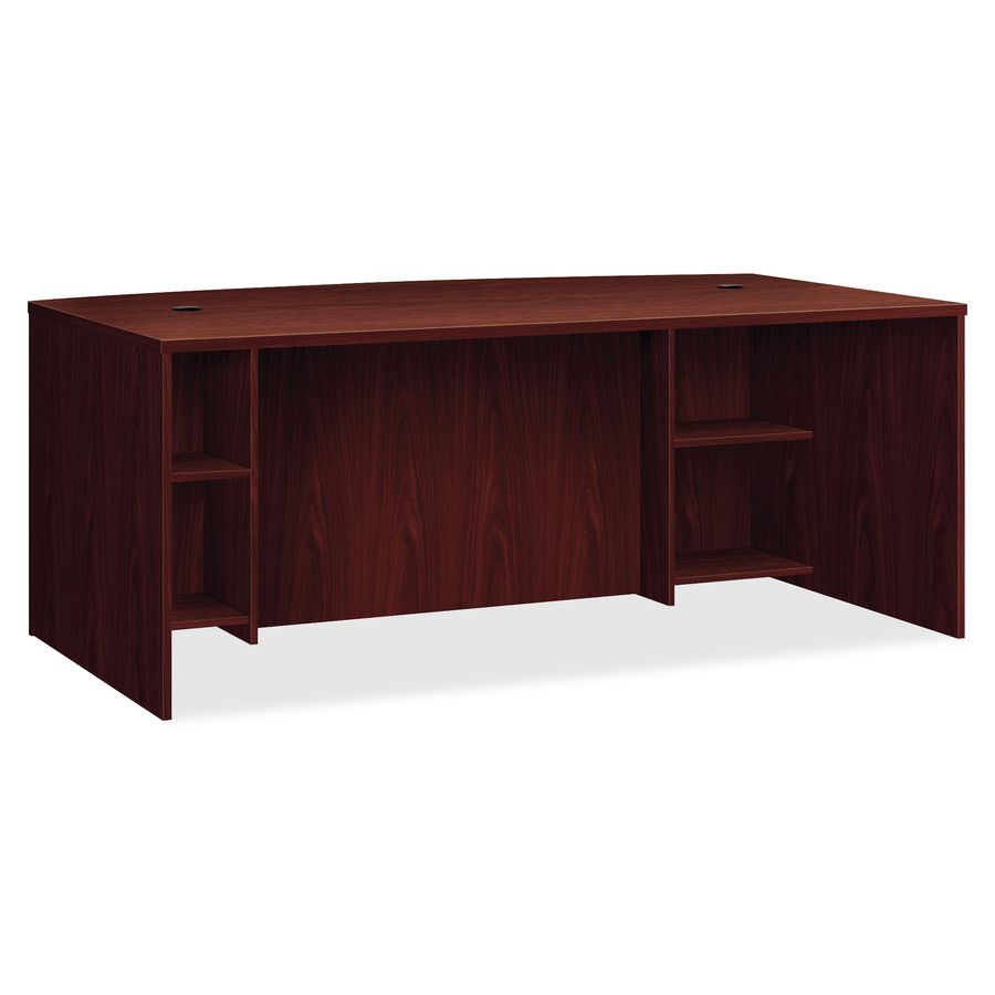 Breakfront Bow Desk Shell is part of the HON BL Laminate Furniture Collection that delivers a professional look on a budget. Tough, affordable and practical, this collection simply makes sense, helping you get the job done without a lot of bother. Modular components support popular, U-shaped and L-shaped layouts. Breakfront design with a bow top offers more legroom for visitor meetings and conferencing. Durable, 1″ thick top is covered with abrasion-resistant, stain-resistant, thermal-fused Mahogany laminate. Modesty panel is full-height for maximum privacy. Desk shell also features two black grommets in the top for easy cord management. Adjustable floor-leveling glides provide 1/2″ of adjustment. 27-3/4″ high pedestals with unfinished tops slide inside this desk shell and are sold separately.