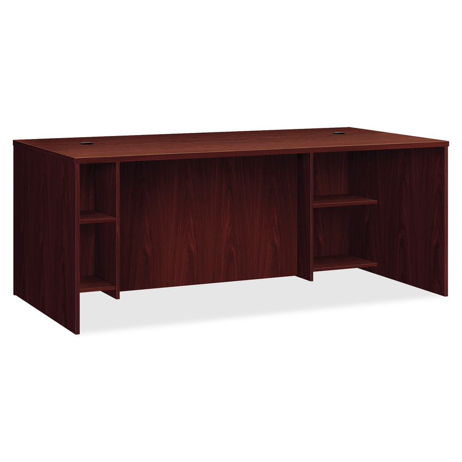 Breakfront Desk Shell is part of the HON BL Laminate Furniture Collection that delivers a professional look on a budget. Tough, affordable and practical, this collection simply makes sense, helping you get the job done without a lot of bother. Modular components support popular, U-shaped and L-shaped layouts. Breakfront design offers legroom for visitor meetings and conferencing. Durable, 1″ thick top is covered with abrasion-resistant, stain-resistant, thermal-fused Mahogany laminate. Modesty panel is full-height for maximum privacy. Desk shell also features two black grommets in the top for easy cord management. Adjustable floor-leveling glides provide 1/2″ of adjustment. 27-3/4″ high pedestals with unfinished tops slide inside this desk shell and are sold separately.