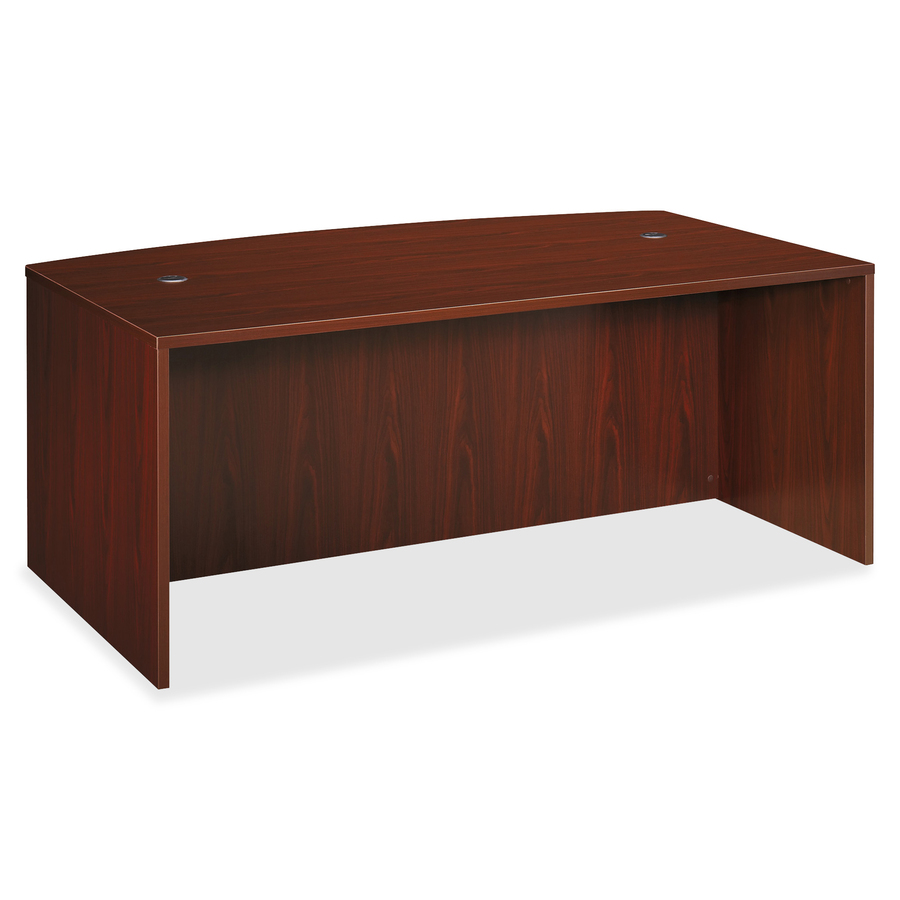 Bowfront desk shell is part of the HON BL Laminate Furniture Collection that delivers a professional look on a budget. Tough, affordable and practical, this collection simply makes sense, helping you get the job done without a lot of bother. Modular components support popular, U-shaped and L-shaped layouts. Durable, 1″ thick top is covered with abrasion-resistant, stain-resistant, thermal-fused Mahogany laminate. Modesty panel is full-height for maximum privacy, and recessed design provides overhang for visitor meetings and conferencing. Desk shell also features two black grommets in the top for easy cord management. Adjustable floor-leveling glides provide 1/2″ of adjustment. 27-3/4″ high pedestals with unfinished tops slide inside this desk shell and are sold separately.