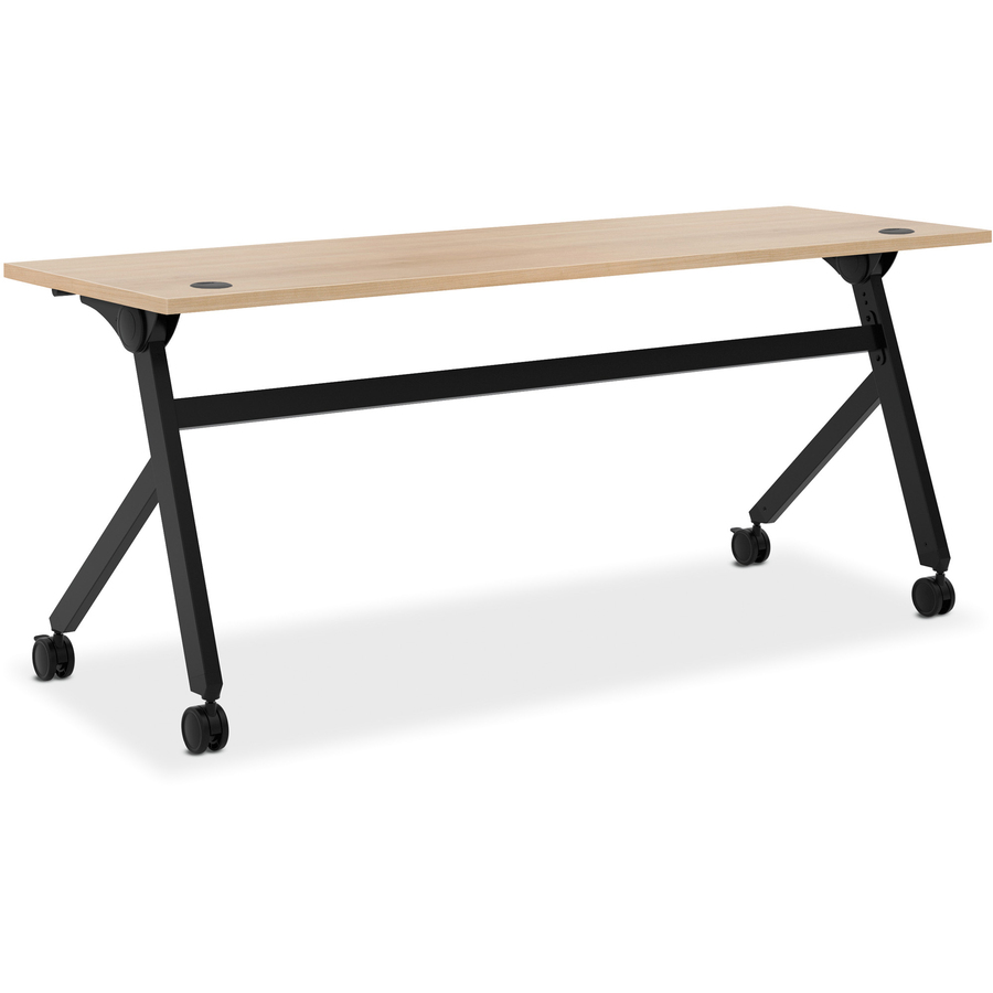 Multipurpose table with flip-top supports flexible meeting space and collaborative work. Use multiple tables side-by-side for training, edge-to-edge for panel discussions or front-to-front for a conference table. The worksurface tilts from work mode to nesting position on sturdy hinges that rotate smoothly. Tilt-lock mechanism is released by a convenient full-width handle, making it quick and easy to store and rearrange tables. 1″ thick worksurface features Wheat laminate that is scratch-resistant, spill-resistant and stain-resistant. Two factory-installed steel beams provide strength and rigidity. Welded steel legs withstand heavy activity and frequent relocation. Move the table easily on four casters and keep it in place with the two locking casters.