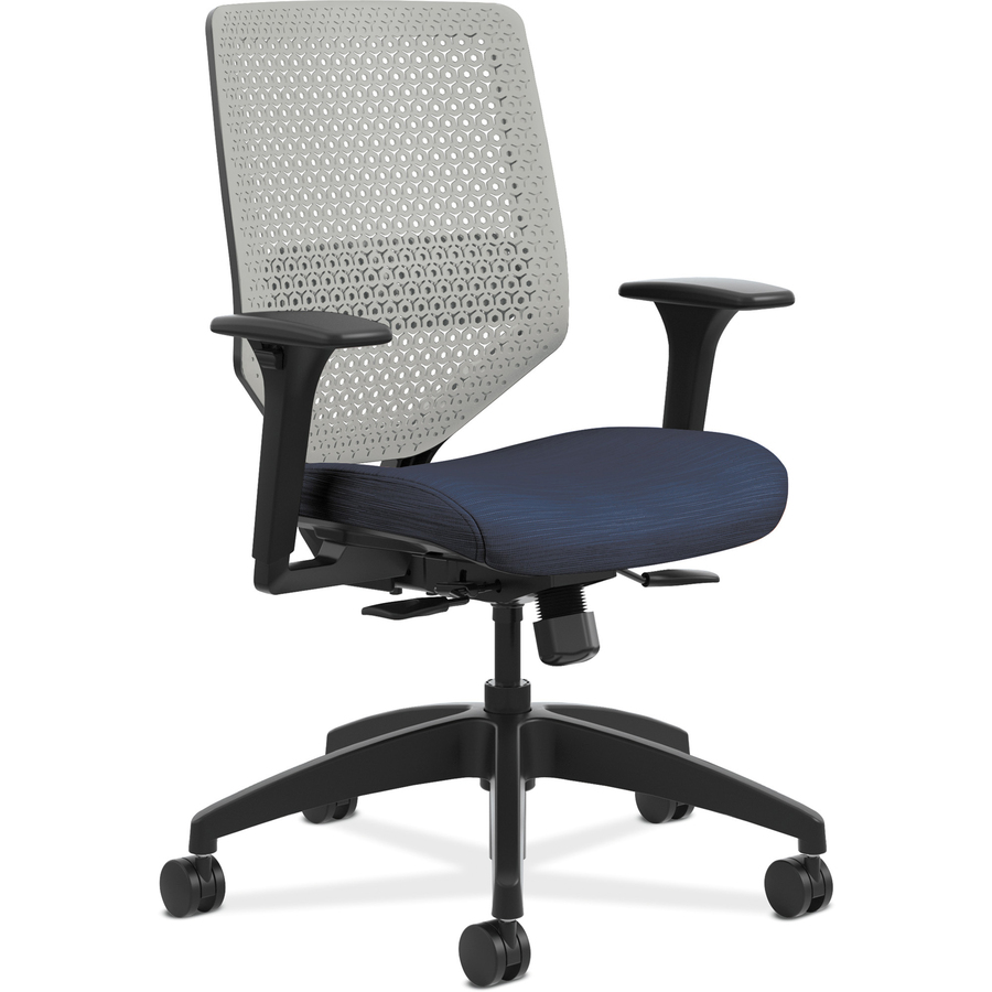 Marketing Information:Solve is the single seating solution that helps a variety of users achieve optimal comfort in workstations, touchdown areas, collaborative environments, meeting rooms and more. This Solve mid-back task chair features a breakthrough ReActiv back material designed to provide enhanced support above and beyond ilira-stretch mesh. It flexes to provide a firm fit and keeps the body cool by enabling continuous airflow. Synchronized seat and back provide proper balance, alignment and lumbar support, and can be adjusted with a single lever. Adjustable-height arms move up and down for shoulder and upper body support. Other functions include pneumatic seat-height adjustment from 18″ to 23″ , 360-degree swivel and tilt tension. Waterfall seat edge promotes better leg circulation. Five-star base is equipped with dual-wheeled casters for smooth mobility. Frame color is black, and ReActiv back color is Titanium. Weight capacity is 300 lb.
