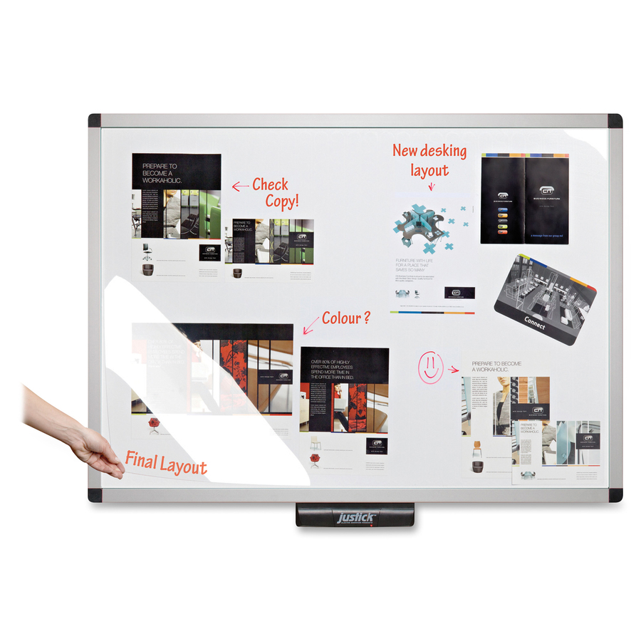 Electro-adhesion holds notices, reminders, illustrations or training materials on the triple-function whiteboard surface without pins, tape, glue or magnets. Whiteboard can be used as a dry-erase board that doesn’t ghost or stain. Lift the clear overlay and place papers on the white surface for use as a bulletin board. Use a dry-erase marker on the clear overlay to interact and illustrate ideas without marking the original items under the overlay. Board is powered by four AA batteries (sold separately) or Justick AC adapter (sold separately).