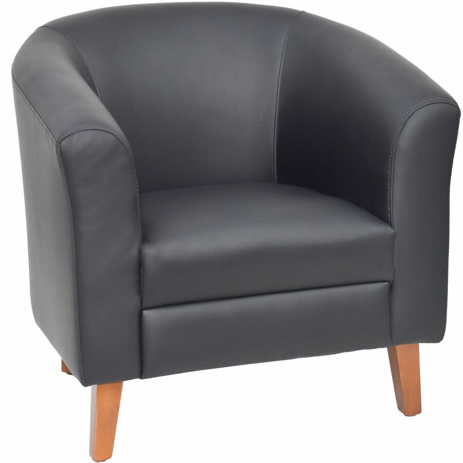 Add style and elegance to any reception or lounge area with this barrel armchair. It is upholstered with black bonded leather for a professional look. Classic design includes a supportive back, nearly full-height arms and a thickly cushioned seat. Four wooden legs hold up to 250 lb. capacity.