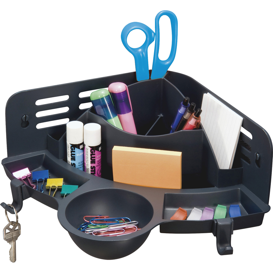 This high-impact plastic Cubicle Panel Corner Organizer provides eight pockets and two hooks to keep everything from scissors to sticky notes to paper clips to keys organized and at the ready. Comes complete with patented click and lock-fastening pins to attach it to fabric-covered panels (can be removed without damaging fabric) or can be attached directly to walls with screws (not included), metal surfaces with magnets (sold separately) or hung from partitions with partition hangers (sold separately). Contains post-consumer recycled material.