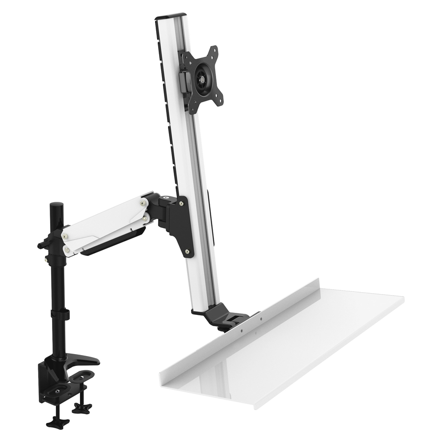 Articulating, full-motion workstation converts any desk or table into a sit-to-stand workstation and allows you to use your computer in a sitting or standing position. Standing part of your workday is healthier and burns calories. Contemporary design allows one-touch movement to adjust your work space to your ideal position. Monitor mount can be adjusted vertically/separately from the keyboard to get that perfect ergonomic height. Design is sturdy and offers a stable worksurface. Large keyboard and mouse tray (26.4″ x 9.1″) give you a lot of flexibility. Tray pivots up and out of the way when you want to use your current desk. Articulating full motion design can attach to the back, side or the middle of your desk (through a grommet hole) with the included clamp and grommet mounting systems. Workstation takes almost no surface space on your desk and swings out of the way when not in use. Additional monitor arm/support bar and a steel accessory tray are sold separately.