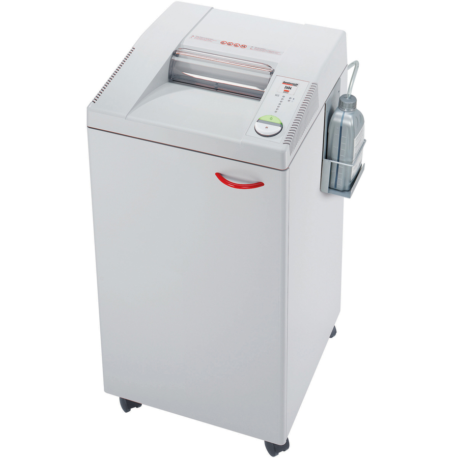 Straight-cut. 3/16″ strips. 10-1/4″ opening. Shreds up to 30 sheets. Speed of 18’/min. Safety protection system creates a transparent shield in the feed opening. Shreds staples, CDs and paper clips. 26-gallon wastebasket. Automatic on/off.