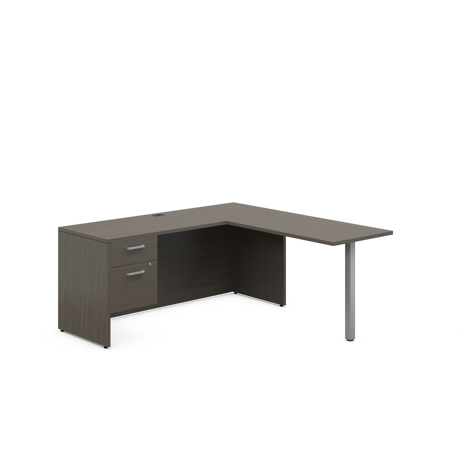 With its clean modern form, Ionic is able to support a wide range of workspace applications. From cubicles to multi-station clusters, private offices or reception areas, Ionic offers well designed practical desk solutions. Work surfaces feature a protective 3mm matching edge L-Shaped Desk. 1 – ML6624C 66″ w/Credenza Shell; 1 – ML4224RI 42″ Rectangular Island w/ monopost; 1 – ML22HBF Hanging BF Pedestal. 66″W x 66″D x 29″H. Absolute Acajou finish.
