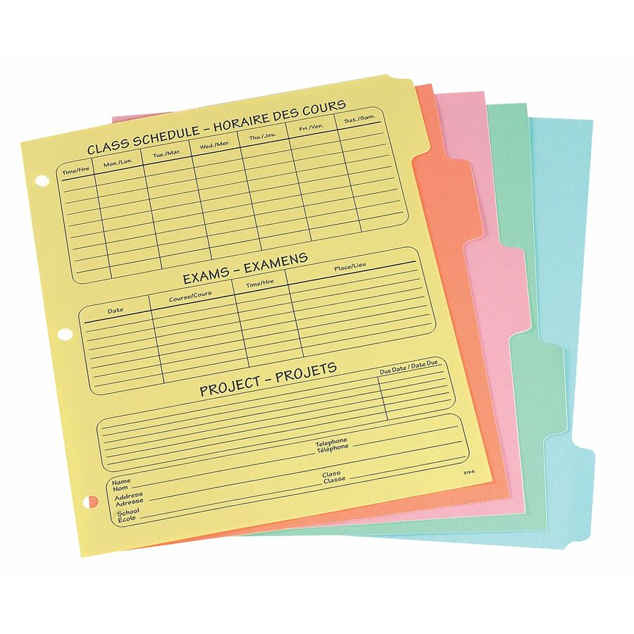 Five-tab index dividers feature a bilingual class schedule printed on the body of first of five dividers to help you stay on track. Eco-friendly design is made with post-consumer material to minimize its overall impact to the environment. Nine point stock is three-hole punched for immediate use with standard three-ring binders (sold separately). Five-tab dividers are perfect for office, home and school use.