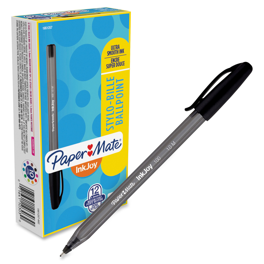 Ballpoint stick pens feature Paper Mate’s revolutionary InkJoy writing system for effortless writing. The InkJoy writing system starts quickly without dragging, requires minimal pressure from your hand, and delivers crisp, clean lines every time. Vividly colored ink applies smoothly and dries quickly. Triangular shape of the InkJoy 100 delivers comfort and control. Use the clip on the barrel to attach it to pockets, notebooks and more. Transparent, color-tinted body offers a refreshing look.