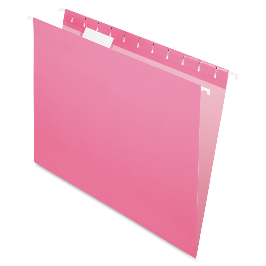 Colored hanging file folders help you organize your documents. Made with crimped style hanging rods for added strength, these durable folders handle multiple documents at a time. Folders offer 1/5-cut tabs and accent colored interiors to prevent misfiles. Eco-friendly design is made with post-consumer material to minimize environmental impact. File folders are perfect for storing files in offices, homes, schools and more.