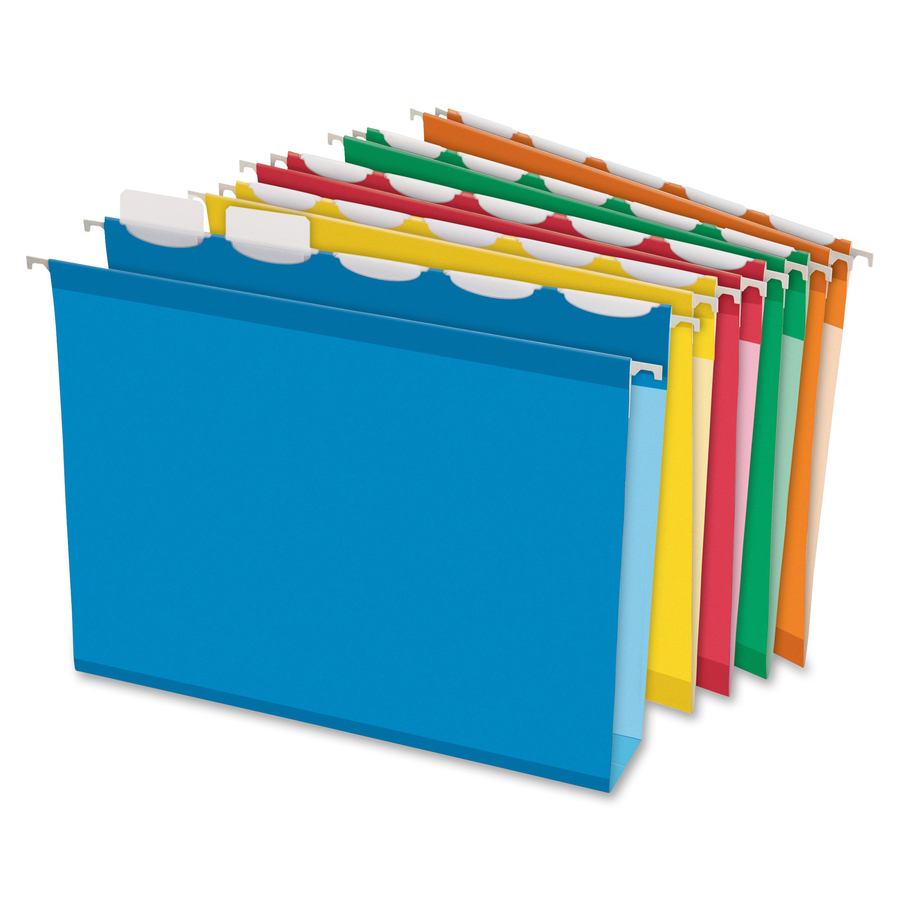 Ready-Tab Reinforced Hanging Folders feature lift-tab technology and extra capacity. Folders are built to store bulky files, catalogs or any other letter-size documents that require extra capacity. Each folder includes reinforcing insert to create 2″ deep box-bottom and hold up to 400 sheets. Two-tone design prevents time-wasting misfiles. Easily change tab position with tabs that are built into the folder. The five tabs easily lift up and down. Write directly on tab or use labels. Printer-ready sheet of labels is included, and labels have permanent self-adhesive. Folders also feature polylaminate strips on top and bottom edges for superior durability. Assorted colors include blue, red, green, orange and yellow.